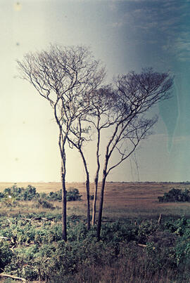 Fotografia colorida em formato retrato. Área de Cerrado típico (Cerrado sentido restrito). Em primeiro plano observa-se vegetação herbáceo - arbustiva nativa do bioma, e ao centro, um grupo de quatro indivíduos arbóreos com copa seca, de espécie não identificada. Em segundo plano, há vegetação rasteira seca com agrupamento de arbustos no canto direito e esquerdo da imagem. Em terceiro plano, observa-se o horizonte, com céu ensolarado.