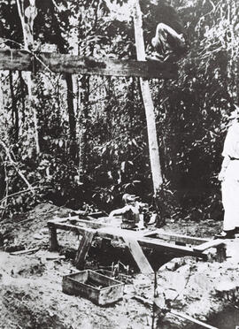 "Fotografia preto e branco, formato retrato. Vista da mata de galeria, presente nas proximidades da construção do Catetinho 1, margeando uma nascente no local. Construção do que aparenta ser uma fossa séptica para ser conectada à edificação. Na fotografia, há dois trabalhadores, um ao lado direito e outro acima de um pedaço de madeira pregado em um fino tronco de uma árvore.