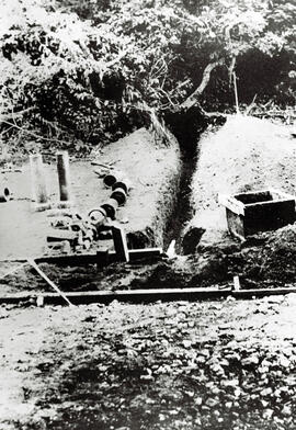 "Fotografia preto e branco, formato retrato. Vista da mata de galeria, originária de uma nascente no local, nas proximidades do Catetinho 1. Em primeiro plano, piso de terra alterado. Em segundo plano, construção, provavelmente, de encanamento devido às tubulações à esquerda da fotografia serem de espessura pequena e o terreno ter modificado para a instalação do equipamento não ser muito profunda. Ao fundo, a vegetação típica de mata de galeria, composta de alta densidade de árvores de médio porte.