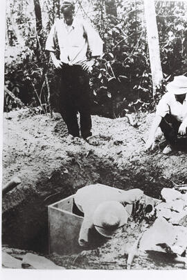 "Fotografia preto e branco, formato retrato. Em destaque, uma grande cavidade com formato retangular, um homem com chapéu de campo e vestes simples está dentro de uma caixa de madeira quadrada inclinando-se com a mão para baixo, para possivelmente realizar alguma mudança na lateral da cavidade em questão. Acima há um solo de terra batida, um trabalhador sem chapéu e com vestes de campo está com a cintura nas mãos observando o ofício de seu colega enquanto ao lado dele está outro membro da obra agachado e utilizando chapéu e roupas simples ordenando o operário que está na fossa. Circundando o terreno está uma amostra da densa mata de galeria, que ocorre devido a presença de uma nascente local.