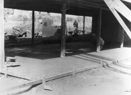 "Fotografia preto e branco, formato paisagem. Vista do pilotis do Catetinho 1 ainda em fase de construção. Em primeiro plano, solo de terra de chão batida contendo alguns entulhos. Em segundo plano, o chão do pilotis,composto de concreto queimado, delimitou sua forma por tábuas de madeira no chão. Pilares de madeira ainda estão sem pintura, em um destes, um trabalhador agachado com vestes de campo e chapéu realizando acabamento. Em terceiro plano, destaca-se fogão à lenha, muito utilizado para realizar as refeições dos moradores. À esquerda, entulhos reunidos da obra e à direita um operário com chapéu e vestes simples com três carrinhos de mão. Ao fundo, mata de galeria, oriunda de uma nascente local. No canto superior direito da foto é possível visualizar tábuas de madeira expostas.