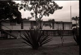 "Fotografia preto e branco, formato paisagem. Vista da fachada principal do Catetinho 1 já finalizado. Em primeiro plano, planta ornamental popularmente conhecida por piteira (Agave sp.), seguida de arbusto de baixo porte e ao lado um recorte de outra piteira (Agave sp.). Em segundo plano, o Catetinho 1 que é praticamente todo de madeira com concreto armado e alvenaria, com linhas simples e elegantes, advinda de sua leve influência da casa colonial brasileira e sua concepção modernista que mistura: racionalidade, funcionalidade, beleza, ausência de beiral do telhado e presença de pilotis, característica comum nos prédios residenciais de Brasília, o qual permite o livre trânsito de pessoas no térreo do edifício. Próximo a escada, há duas árvores grandes típicas do cerrado. Ao fundo há uma mata de galeria, de vegetação rasteira, e na extrema direita, há mais um exemplar de piteira (Agave sp.) e um coqueiro de médio porte, além de um poste de madeira com fiação elétrica já instalada.