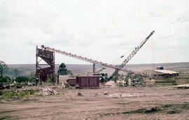 Cena da foto (25) vista por outro ângulos. A máquina vermelha está à frente, com um trabalhador montado no topo. Aqui, é é possível perceber melhor os detalhes do barracão que não tem sua estrutura pronta - ainda estão forrando o telhado. Outros elementos são pedras, marcas de máquinas que passaram na lama, gabarito de madeira. Existem vários trabalhadores pelas máquinas, inclusive um operando o guindaste preto.