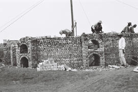 Olaria Brasília (similar a fotografia [33]). Quatro trabalhadores assentando os tijolos maciços por cima do forno, e um em pé na frente à direita.