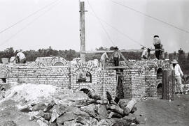 Forno de olaria em construção, no verso da foto ampliada lê-se: “Olaria Brasília”. O local é o mesmo do item 32 desta pasta, provavelmente em São Sebastião, onde funcionaram muitas olarias que forneceram tijolos cerâmicos para construção da cidade. Na imagem se vê ainda oito homens trabalhando, não foi possível identificá-los, todos vestindo chapéus. É interessante observar o mastro que se encontra ao centro, auxiliando na estruturação do forno. Ao fundo está uma faixa densa de Cerrado.