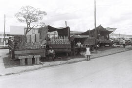 Fotografia em formato paisagem, preto e branco. A imagem destacada ao longo do canteiro central, em terra batida, da Avenida W3 sul na altura da atual quadra 508 ambulantes com produtos alimentícios em carrocerias de caminhões, no dia 22 de abril de 1960, dia seguinte à inauguração de Brasília. Dentre os produtos algumas embalagens que se assemelham a doces regionais e uma carga de garrafões envolvidos por palha. À frente dos caminhões observamos alguns vendedores e uma figura infantil feminina negra. A menina usa um vestido branco e carrega uma leiteira de alumínio enquanto caminha em direção à via asfaltada da avenida. Ao fundo destaca-se uma árvore de grande porte nativa de Cerrado. Observam-se também alguns postes de madeira dispersos conectados pela fiação elétrica e edifícios concluídos ao longo da avenida. De acordo com o livro NOVACAP: 50 ANOS DE BRASÍLIA a Avenida W3 sul teve grande relevância comercial durante a construção da cidade: "Nas primeiras duas décadas de inauguração da Capital, a W3 se afirmou como a grande artéria que suportava o maior fluxo de trânsito da cidade, pois, nela se estabeleceu o maior pólo comercial e financeiro do Distrito Federal com suas lojas, bancos e outras atividades comerciais. " (NOVACAP,2010,p.118). Ver também o item B.7 (10).