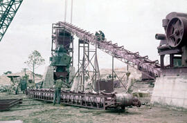 "Fotografia colorida, formato paisagem, mostra maquinário em cascalheira próximo à barragem do Lago Paranoá. A imagem registra o momento de montagem do britador (equipamento com esteira diagonal), com o auxilio de um guindaste da empresa Manitowoc. Próximo à esteira, vê-se homens junto a ela. Sobre a esteira do britador já erguida, nota-se a presença de duas figuras masculihas. Nos itens B10 (34), B10 (40), B10 (91) e B10 (92) é possível ver o guindaste sendo utilizado para a montagem do britador. No terceiro plano vê-se área de pilhas de areia, prontas para serem transportadas para as obras, além de alguns indivíduos arbóreos nativos do Cerrado. Ver imagens complementares: itens B10 (32), B10 (36), B10 (40), B10 (92), B10 (99) e B10 (100). No grupo B04 (Materiais de Construção), itens B04 (25) e B04 (27), também é possível ver fotografias de maquinários em cascalheiras. Para a identificação do maquinário, contou-se com a consultoria do professor Oscar Luís Ferreira (FAU UnB). Fotografia de Mário Fontenelle.