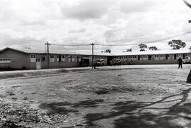 Fotografia preto e branco em formato paisagem. A imagem tem por tema central a fachada do hospital do Instituto dos Industriários (Instituto de Aposentadorias e Pensões dos Industriários – IAPI). Prédio construído em madeira. A fachada parece contornar um pátio cujo piso é de terra. Algumas pessoas e automóveis estacionados. Imagem semelhante ao item n. 7. Atualmente, o local é o Museu Vivo da Memória Candanga, localiza-se no Núcleo Bandeirante. Destinado a atender aos trabalhadores envolvidos na construção de Brasília. O hospital foi inaugurado no dia 21 de junho de 1957 pelo presidente de Portugal general Craveiro Lopes. No entanto, foi reinaugurado quase um mês depois, no dia 6 de julho, com o nome de Hospital Juscelino Kubitschek, conforme publicado na revista Brasília (Novacap, n. 7, p. 16). Presentes ao evento estavam dirigentes da Novacap, médicos que participaram da intitulada “Primeira Reunião Científica de Brasília” e vereadores cariocas. De acordo com o artigo da revista citada, o hospital de madeira foi construído em apenas cinco meses de trabalho e aparelhado com modernos equipamentos. Com capacidade de atendimento para cinquenta leitos, possui duas salas de operações, dois apartamentos, aparelhos de raios-X, laboratório para exames, ambulatório, sala de ortopedia, maternidade, berçário, farmácia, gabinete dentário entre outras estruturas necessárias ao atendimento.