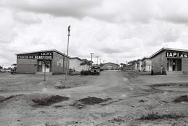 Fotografia em preto e branco em formato paisagem. Hospital do Instituto dos Industriários (Instituto de Aposentadorias e Pensões dos Industriários – IAPI). Em primeiro plano a avenida composta de moradias para os profissionais de saúde que trabalhavam no hospital e escritórios do IAPI, conforme mostrado na imagem. Ao fundo a fachada do hospital. Algumas pessoas estão próximas à agência do IA.P.I.. Um automóvel, modelo Jeep, está estacionado na avenida. Os escritórios, as residências e o hospital possuem a madeira como elemento construtivo. Imagem semelhante ao item n. 6. Atualmente, o local é o Museu Vivo da Memória Candanga, localiza-se no Núcleo Bandeirante. Destinado a atender aos trabalhadores envolvidos na construção de Brasília. O hospital foi inaugurado no dia 21 de junho de 1957 pelo presidente de Portugal general Craveiro Lopes. No entanto, foi reinaugurado quase um mês depois, no dia 6 de julho, com o nome de Hospital Juscelino Kubitschek, conforme publicado na revista Brasília (Novacap, n. 7, p. 16). Presentes ao evento estavam dirigentes da Novacap, médicos que participaram da intitulada “Primeira Reunião Científica de Brasília” e vereadores cariocas. De acordo com o artigo da revista citada, o hospital de madeira foi construído em apenas cinco meses de trabalho e aparelhado com modernos equipamentos. Com capacidade de atendimento para cinquenta leitos, possui duas salas de operações, dois apartamentos, aparelhos de raios-X, laboratório para exames, ambulatório, sala de ortopedia, maternidade, berçário, farmácia, gabinete dentário entre outras estruturas necessárias ao atendimento.