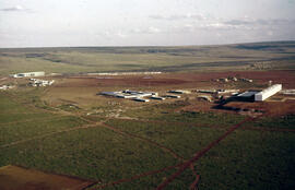 Fotografia colorida em formato paisagem. Vista aérea da composição territorial do Brasília Palace Hotel próximo ao Palácio da Alvorada. O Brasília Palace Hotel foi projetado em 1956 pelo arquiteto e urbanista Oscar Niemeyer (1907-2012), sob a direção da NOVACAP (Companhia Urbanizadora da Nova Capital do Brasil), sendo inaugurado em 30/6/1958, sendo uma das primeiras construções do que posteriormente veio a ser o plano de Lucio Costa (1902-1998) para a nova capital. Composição das duas primeiras construções do que posteriormente veio a ser o plano de Lucio Costa para a nova capital. Ainda no terço central da imagem, no quadrante intermediário direito, tem-se a presença do hotel em fase final de construção, fachadas oeste - de elementos vazados - e a norte finalizadas. No plano de fundo, no quadrante superior esquerdo, o vislumbre do que configura o volume construtivo do Palácio da Alvorada - barra horizontal e os pilares - com a capela anexa (ALMEIDA, 2012, p.72). Nos arredores dos dois edifícios, tem-se a presença de agrupamentos de canteiros e instalações de apoio aos trabalhadores. No quadrante superior, do centro à direita, há a presença de prováveis agrupamentos residenciais para os trabalhadores. Delimitações de estradas ainda em terra batida evidenciam os percursos de acesso ainda não pavimentados no entorno do hotel, no período de obras. O horizonte contextualiza o ambiente - até então, pouco habitado dado aos primeiros anos da construção de Brasília - em torno do que veio a ser a península do lago Paranoá. Torna-se nítido a presença do Cerrado pelo horizonte, com trechos de vegetação campestre (campo sujo) principalmente ao redor do Palácio da Alvorada e do Brasília Palace Hotel, e trechos com maior densidade de árvores. Entre os dois edifícios (Brasília Palace Hotel e Palácio da Alvorada) do registro e na porção inferior esquerda, nota-se a ocorrência de ação antrópica devido à área descampada, aparente uso de maquinário para retirada de terra, não havendo a presença de árvores ou gramíneas. O edifício foi inaugurado juntamente com o Palácio da Alvorada em 30/06/1958, o Brasília Palace Hotel, foi um habitual ponto de encontro para os pioneiros, políticos e diplomatas na década de 60, além de hospedar os visitantes da nova capital. Em 1978, foi inutilizado após um incêndio causado por uma cafeteira esquecida na tomada do terceiro andar e sua reconstrução só foi concluída no ano de 2007, com a entrega da restauração das obras de autoria de Athos Bulcão (1918-2008). Imagens complementares podem ser encontradas nos grupos\maços: nov-d-4-4-b-2; nov-d-4-4-b-6; nov-d-4-4-b-19; nov-d-4-4-b-23; nov-d-4-4-b-1;