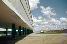 Fotografia colorida em formato paisagem da fachada do Brasília Palace Hotel em perspectiva, entre os anos de 1959-1960 em Brasília, DF. O prédio se estende transversalmente nos dois quadrantes esquerdos da imagem, apresentando placas destoantes em sua laje. Abaixo do prédio, seis carros estão estacionados, dentre eles uma Rural Willys, um Ford F100 amarelo e uma Kombi, atrás de um gramado plantado. Ao lado da Kombi, uma placa de fundo preto está cravada na grama. É nítida a etapa avançada de construção, restando apenas alguns pisos a serem pavimentados. Ao fundo, um largo grupo de operários (aproximadamente 12) se desloca sobre o terreno de terra seca batida e entre materiais de obra. Próximo ao grupo, dois ônibus amarelos Mercedes de transporte de funcionários e um caminhão estão estacionados. Atrás da caçamba do caminhão, três operários: um de calças azuis e sem camisa se escora em uma carriola; ao lado, outro operário com vestimentas claras leva a mão esquerda ao rosto; mais acima sobre a pilha de terra vermelha, um operário de calças jeans e camisa em tom bege estica a mão para alcançar algo. Atrás dos montes de terra vermelha estão vários funcionários e uma estrutura vertical, cilíndrica e branca, assemelhando-se a uma estrutura de torre de caixa d’água. No horizonte, a vegetação do Cerrado se estende com fitofisionomias diversas que se distribuem em forma de mosaico. O prédio do Palace Hotel, inaugurado em 30/6/1958 - mesmo dia do Palácio da Alvorada - foi projetado por Oscar Niemeyer (1907-2012) para ter três pavimentos de fachadas e duas empenas cegas (fachadas sem aberturas - portas ou janelas) em mármore branco, com uma extensão de cobertura para um segundo bloco menor - em formato de T - destinado às atividades sociais do conjunto. Toda a estrutura do bloco principal se equilibra sobre pilotis metálicos revestidos de alumínio anodizado preto por 203 metros de comprimento. O edifício foi inaugurado juntamente com o Palácio da Alvorada em 30/06/1958. O Brasília Palace Hotel foi um habitual ponto de encontro para os pioneiros, políticos e diplomatas na década de 60, além de hospedar os visitantes da nova capital. Em 1978, foi inutilizado após um incêndio causado por uma cafeteira esquecida na tomada. Sua reconstrução foi concluída no ano de 2007, com a entrega da restauração das obras de autoria de Athos Bulcão.
