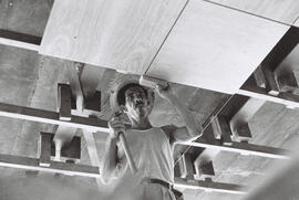 Fotografia em preto e branco no formato paisagem do interior do Brasília Palace Hotel, retirada na data de 24/03/1958, em Brasília-DF. A representante digital contém pontos brancos e um risco preto. A imagem captura o momento em que um operário faz a colocação de placas de um forro de madeira no segundo bloco térreo do Palace, provavelmente na área do salão de festas. O enquadramento da imagem evidencia que o fotógrafo desejou capturar o momento de trabalho do operário, que com seu martelo - em punho, na mão direita - e um tijolinho - abraçado pelos dedos, na mão esquerda, garante o alinhamento das placas de madeira do forro. O operário utiliza uma calça de tecido clara, ajustada por um cinto preto de fivela metálica e, por dentro da calça, uma regata clara de tecido leve. Sobre sua cabeça, um chapéu que parece ser de palha faz as vezes de um capacete. No período da construção de Brasília os acidentes de trabalho eram comuns devido à ausência ou limitação de equipamentos de proteção essenciais fornecidos, além de serem escondidos os relatos das manchetes e jornais. A feição do homem que aparenta ter meia idade, tem como características físicas: dois sinais do lado direito da face, bigode, e cabelo escuro. É notado seu semblante de foco para com o serviço executado. É possível ver que a estrutura metálica e as placas pré-moldadas que compõem a estrutura da laje ainda estão aparentes em metade da imagem, apoios de madeira e fios garantem o prumo da colocação das placas. “Embora o concreto armado fosse o principal recurso estrutural empregado por Niemeyer em seus projetos, para o edifício deste hotel edificado em caráter de urgência foi escolhido o emprego de perfis estruturais metálicos revestidos de concreto e outros materiais de acabamento como o alumínio, o mármore e o lambril.” (ESNAL, 2015, p. 123). No canto inferior esquerdo, uma sombra, provavelmente da mão do fotógrafo. Autor da fotografia: Mario Fontenelle