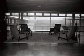 Fotografia preta e branca no formato paisagem com manchas azuladas e riscos brancos, retrata o mezanino sobre o saguão de entrada do Brasília Palace Hotel, construído entre os anos de 1957 a 1960, em Brasília-DF. O hotel foi projetado em 1956 pelo arquiteto e urbanista Oscar Niemeyer (1907- 2012), sob direção da NOVACAP (Companhia Urbanizadora da Nova Capital do Brasil). Sobre uma peça de tapeçaria, quatro poltronas de encosto alto estão dispostas em volta de uma mesinha ao centro. em segundo plano, uma parede com placas de vidro em esquadrias de alumínio que vão do chão ao teto cobertas por persianas com a vista voltada para onde, futuramente, veio a ser o lago Paranoá. Do lado direito há duas poltronas Bardi’s Bowl, projetada em 1951 por Lina Bo Bardi (1914-1992) em frente a uma mesinha com um arranjo de folhagem em cima. Logo atrás do saguão, há gramado plantado e no horizonte a vegetação do Cerrado se estende. O Brasília Palace Hotel foi inaugurado juntamente com o Palácio da Alvorada em 30/06/1958, servindo de hospedaria para Juscelino Kubitschek (1902-1976), servidores vindos de outros pontos do país, pioneiros, políticos e diplomatas na década de 60, além de visitantes da nova capital. se tornou cenário de grandes eventos, espaço de confraternização e convivência dos pioneiros, gente da alta sociedade, políticos e embaixadores. Em toda a sua história, hospedou desde importantes figuras políticas à celebridades, como: a Rainha Elizabeth II (1926-2022), Fidel Castro (1926-2016), Gisele Bündchen (1980-), Caetano Veloso (1942-) e Tom Jobim (1927-1994).