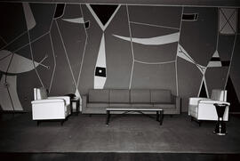 Fotografia em preta e branco no formato paisagem, retrata o interior do salão de festas do Brasília Palace Hotel, construído entre os anos de 1957 a 1960, em Brasília-DF. O hotel foi projetado em 1956 pelo arquiteto e urbanista Oscar Niemeyer (1907- 2012), sob direção da NOVACAP (Companhia Urbanizadora da Nova Capital do Brasil). Ocupando lugar de destaque ao fundo um grande afresco de Athos Bulcão (1918- 2008) feito em 1958 com as dimensões de 3,25m de altura e 26m de largura - uma pintura mural feita sobre alvenaria - composta por linhas finas brancas e formas abstratas nas cores branca e preta sobre um fundo azul (cor nº 55 na escala cromática de Athos Bulcão). A frente sobre o piso flutuante de madeira, uma peça de tapeçaria delimita um espaço de convivência com duas poltronas, uma mesa de apoio com um telefone disco, ao lado um sofá de quatro lugares e ao centro uma mesa com a base em alumínio. Do lado da poltrona à direita, tem uma lixeira em formato semelhante a uma ampulheta. O Brasília Palace Hotel foi inaugurado juntamente com o Palácio da Alvorada em 30/06/1958, se tornou cenário de grandes eventos, espaço de confraternização e convivência dos pioneiros, gente da alta sociedade, políticos, embaixadores e dos servidores vindos de outros pontos do país, que se encontravam nos bailes e festas. Em toda a sua história, hospedou desde importantes figuras políticas à celebridades, como: a Rainha Elizabeth II (1926-2022), Fidel Castro (1926-2016), Gisele Bündchen (1980-), Caetano Veloso (1942-) e Tom Jobim (1927-1994).