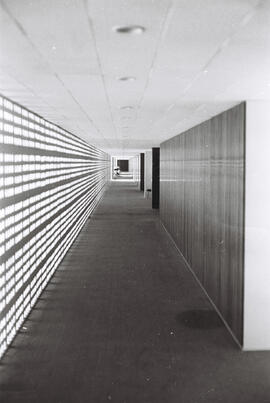 Fotografia preta e branca no formato retrato, representante digital consta manchas e riscos, captura o corredor de acesso aos quartos do Brasília Palace Hotel, construído entre os anos de 1957 a 1960, em Brasília-DF. Foi projetado em 1956 pelo arquiteto e urbanista Oscar Niemeyer (1907- 2012), sob direção da NOVACAP (Companhia Urbanizadora da Nova Capital do Brasil). Um grande corredor com o piso em carpete, constando uma mancha redonda escurecida do lado direito, próximo ao rodapé da parede de painel ripado de madeira que se estende por toda a extensão do corredor, contendo aberturas de acesso aos quartos. Ao lado esquerdo cobogós vazad,os com dezesseis furos cada peça, permitindo a passagem de luz solar e ventilação natural, se estendendo por todo o corredor. No lajeamento pontos de iluminação redondos acoplados na parte central do forro. No fundo da fotografia - do lado esquerdo - um carrinho de camareira e uma vassoura apoiada na parede de cobogós. O edifício foi inaugurado juntamente com o Palácio da Alvorada em 30/06/1958, o Brasília Palace Hotel se tornou cenário de grandes eventos, espaço de confraternização e convivência dos pioneiros, gente da alta sociedade, políticos, embaixadores e dos servidores vindos de outros pontos do país, que se encontravam nos bailes e festas. Em toda a sua história, hospedou desde importantes figuras políticas à celebridades, como: a Rainha Elizabeth II (1926-2022), Fidel Castro (1926-2016), Gisele Bündchen (1980-), Caetano Veloso (1942-) e Tom Jobim (1927-1994).