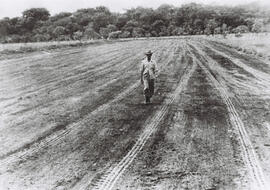 "Fotografia preta e branca em formato paisagem. Representante digital consta manchas brancas e deterioração devido às ações do tempo. Registro térreo de um senhor caminhando em direção ao fotógrafo transitando sobre o solo de terra batida em uma região em processo de terraplenagem, em Brasília, durante os primeiros anos de construção da nova capital, entre os anos de 1956 e 1957. O senhor na imagem, possivelmente, trata-se de um operário candango, trajando um chapéu claro, camisa de botão branca semi aberta, calça larga com cinto preto de fivela e botas escuras, e um vislumbre do que parece ser um relógio em seu braço esquerdo. Sua fisionomia faz retratar um senhor de meia idade com pele escura, caminhando no sentido do registro, com postura ereta e olhares fixos no fotógrafo. Ele caminha sobre um solo descampado, que devido a ação antrópica, reflete o desmatamento ocasionado durante o período de construções da vias e edificações em Brasília. A região caracteriza-se por um solo retangular terraplanado, cercado por vegetação de Cerrado, onde, nas laterais (esquerda, direita e um pequeno trecho no plano de fundo) nota-se vegetasção campestre (campo sujo) e ao fundo mata de galeria que acompanha algum curso d'água. A diferença de solo é percebida pela mudança abrupta entre a grama e o solo terroso, com pequenas porções de terra demarcando parte do retângulo terraplanado. Em evidência, identificam-se marcas de pneus, marcando os fluxos dos maquinários e veículos utilizados no auxílio do nivelamento do solo para recebimento de pavimentação. Ao fundo, a vegetação se adensa, configurando uma vegetação de Cerradão típico (Cerrado Sentido Amplo) com a presença de árvores adensadas de médio e grande porte. Um fato histórico relevante foi que, durante a década de 1940, Getúlio Vargas (1882-1954) incentivou a ocupação do Cerrado Brasileiro, por meio do slogan “Marcha para o Oeste” havendo um pleno incentivo a ocupação do interior do Cerrado, a partir daí, com a construção de Brasília na década de 1950 o fluxo de imigrantes foi cada vez maior, ocasionando forte adensamento demográfico e consequentemente, a construção da infraestrutura necessária para o acesso a região – por meio das rodovias. A principal problemática dessa ocupação foi, justamente, a demasiada degradação do ecossistema causado durante o processo, afetando diretamente a vegetação do Cerrado existente (Brochado, 2014).