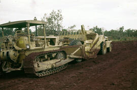 "Fotografia colorida no formato paisagem contendo manchas e pontos verdes, retrata um canteiro de obra com bastante movimentação de terra em Brasília-DF entre os anos de 1958 a 1960. Na metade esquerda da fotografia, um trator de esteira D7 amarelo da marca caterpillar, na cabine, um trabalhador - com roupas beges e chapeus - está sentado sobre o equipamento. Estacionado no quadrante direito da fotografia, um Escrêiperes amarelo com a gravação da marca “caterpillar” na parte traseira e na lateral. Ao fundo, à esquerda da via, observa-se vegetação de cerrado típico (cerrado sentido restrito). De acordo com o Diário de Brasília (1957) alguns dos primeiros maquinários – uma “patrol” e tratores – que contribuíram para as construções de Brasília vieram da cidade de Goiânia, sob responsabilidade do Engenheiro Bernardo Sayão (1901-1959), para auxiliar nas obras do campo de pouso de emergência.