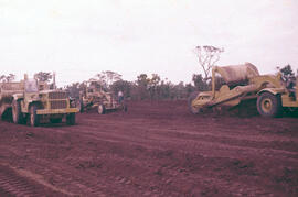 "Fotografia colorida no formato paisagem contendo manchas e pontos verdes. Registro térreo retrata um canteiro de obra com bastante movimentação de terra em Brasília-DF, entre os anos de 1956 a 1960. No primeiro terço à esquerda da fotografia, sobre um terreno de terra movimentada, um CAT 621B da marca caterpillar conduzida por um operário. À direita, uma motoniveladora da marca caterpillar operada por outro funcionário que está de pé sobre o vínculo, ao lado um homem de pé com blusa branca, calça jeans e as mãos nos bolsos. Na porção direita, vê-se parte de uma Escrêiperes da marca caterpillar operada por um trabalhador que olha diretamente para o fotógrafo. Em último plano, observa-se vegetação de cerrado típico (cerrado sentido restrito). Segundo relatos do Diário de Brasília (1957), até o final daquele ano, as obras da nova capital já contavam com cerca de, 237 km de estradas internas, 1.397.000 m² de área desmatada e 470.000 m³ de terraplenagem, enquanto os locais destinados às construções do Plano Piloto já apresentam 1.014.299 m³ de terraplenagem e desmatamento com aproximados 6.000.000 m².” (31/12/57) (p. 152).