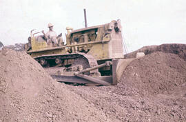 "Fotografia colorida no formato paisagem contendo manchas e pontos verdes, retrata um canteiro de obra com bastante movimentação de terra em Brasília-DF entre os anos de 1956 a 1960. No centro da fotografia, um trator de esteira D7 amarelo da marca caterpillar, com a numeração “11214” gravada em preto abaixo do assento, onde um trabalhador - de roupas beges e chapéu - opera a máquina. Atrás do maquinário, no quadrante superior esquerdo, está aparente a copa de uma árvore. Segundo relatos do Diário de Brasília (1957), até o final daquele ano, as obras da nova capital já contavam com cerca de, 237 km de estradas internas, 1.397.000 m² de área desmatada e 470.000 m³ de terraplenagem, enquanto os locais destinados às construções do Plano Piloto já apresentam 1.014.299 m³ de terraplenagem e desmatamento com aproximados 6.000.000 m².” (31/12/57) (p. 152).