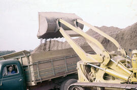 "Fotografia colorida no formato paisagem contendo manchas e pontos verdes, retrata um canteiro de obra com bastante movimentação de terra em Brasília-DF entre os anos de 1956 a 1960. No quadrante inferior, um caminhão International L-160 em um tom de verde escuro, no assento do motorista um homem aguarda a Pá carregadeira de esteira D7 amarela abastecer o caminhão com a terra decorrente da movimentação do solo, vestindo uma camisa azul e tem o semblante concentrado na atividade. Atrás do maquinário, no quadrante inferior esquerdo, estão aparentes as copas das árvores. Segundo relatos do Diário de Brasília (1957), até o final daquele ano, as obras da nova capital já contavam com cerca de, 237 km de estradas internas, 1.397.000 m² de área desmatada e 470.000 m³ de terraplenagem, enquanto os locais destinados às construções do Plano Piloto já apresentam 1.014.299 m³ de terraplenagem e desmatamento com aproximados 6.000.000 m².” (31/12/57) (p. 152).