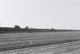 Fotografia preta e branca em formato paisagem. Registro térreo do processo de terraplenagem do Eixo Monumental próximo a Praça dos Três Poderes, em Brasília-DF, durante os primeiros anos de construção da capital (1956-1957). Parte da extensão do processo de aplainamento para posterior asfaltamento do Eixo Monumental e Praça dos Três Poderes. A terra batida se faz evidente em grande parte do registro, evidenciando marcas de passagem dos maquinários responsáveis pelo processo de terraplenagem. A via Eixo Monumental se configura por ser uma reta transversal direcionada aos setores administrativo, cívico, cultural, de abastecimento e rodoviário, dividindo o setor residencial em asas sul e norte. Na via, algumas marcações com pedaços de madeira delimitam os eixos e canteiros: pequenos tocos colocados perpendicularmente à via e galhos finos delimitando as delimitações. Ao fundo no registro, um talude arenoso separa o solo terraplanado, possivelmente se tratando de umas das vias S1 e N1 do Eixo Monumental. Um ônibus e um carro transitam na via, aparentando estar asfaltado, logo, em funcionamento, enquanto mais ao fundo, árvores esparsas de médio porte percorrem o canteiro lateral da estrada.