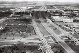 "Fotografia preta e branca em formato paisagem retrata a construção das edificações próximas ao Eixo Rodoviário Sul (eixão), registrada entre os anos de 1957-1960, em Brasília-DF. Representante digital contém manchas brancas e marcas de ressecamento ou risco na imagem. Vista aérea das três vias do Eixo Rodoviário (que recebem a alcunha de eixão - via central e maior, com 6 faixas separadas por uma faixa especial presidencial - e eixinhos - pistas duplicadas de duas faixas cada, localizadas em ambos os lados da via central), ainda a receber delimitações de via (como faixas e meio-fio) e, entre os intervalos das pistas, nota-se vegetação de cerrado típico (cerrado sentido restrito), com trechos mais rasteiros devido a intervenção humana, e trechos ainda pouco modificados, evidente na lateral esquerda. Além disso, a vegetação do Cerrado se estende pelo horizonte, com trechos campestres (campo sujo/limpo) e trechos com maior densidade de árvores (fitofisionomia não identificada). No quadrante superior esquerdo estão os blocos residenciais das quadras 200 e 400, enquanto que no quadrante superior direito estão blocos das quadras 100 e 300, e alguns prédios comerciais e alojamentos de apoio ao canteiro de obras mais ao centro (provável quadra 104 sul). Nas vias é possível ver carros transitando nas faixas, um caminhão e um carro menor fazendo as tesourinhas (trevos feitos para a entrada de quadras). No plano de Lucio Costa (1902-1998) para o projeto do Plano Piloto, os eixos se Cruzaram em uma perpendicular, sendo o Eixo Monumental uma reta transversal direcionada aos setores administrativo, cívico, cultural, de abastecimento e rodoviário, dividindo o setor residencial em asas sul e norte; e o Eixo Rodoviário uma longitudinal arqueada de acordo com a topografia, responsável por transitar livremente entre o setor residencial, ligando extremos da cidade. Nas palavras do próprio autor do projeto para a Revista Brasília (1957, p.10) sobre o eixo: “Dêsse [sic] modo e com a introdução de três trevos completos em cada ramo do eixo rodoviário e outras tantas passagens de nível inferior, o tráfego de automóveis e ônibus se processa tanto na parte central quanto nos setores residenciais sem qualquer cruzamento"" (Costa, 1957, p.10). Para as superquadras residenciais, o arquiteto e urbanista Nauro Esteves (1923-2007) - bastante atuante na construção de Brasília - explicou ao Arquivo Público do DF que, por não haver tempo hábil de desenvolver quadra por quadra, foram elaborados seis modelos básicos de quadra. O primeiro projeto foi o da SQS (superquadra sul) 113, em 1957; depois as quadras SQS 105 e 305, por Hélio Uchôa (1913-1971), no mesmo ano; Em 1958, SQS 108 por Oscar Niemeyer (1907-2012); Em 1959, SQS 308 por Marcello Campello (1928-1964) e Sérgio Rocha; A construção das quadras não obedeceu essa ordem projetual. O primeiro bloco residencial a ficar pronto foi o da SQS 306 - bloco do IAPC (Instituto de Aposentadoria e Pensões dos Comerciários) - e, na Asa Norte, que foi construída só em 1966, começou pela SQN (superquadra norte) 312, a cinco quilômetros de distância do centro do Plano Piloto.