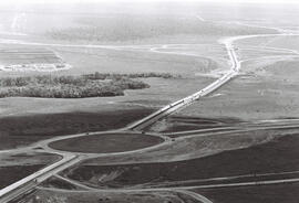 " Fotografia preta e branca em formato paisagem. Registro aéreo do “Balão do Aeroporto” com o trevo que faz conexão viária da Estrada Parque Aeroporto (EPAR ou DF-047), e a Estrada Parque Dom Bosco (EPDB ou DF-025), em Brasília-DF, durante os primeiros anos da construção da capital (1956-1958). No quadrante inferior, o Balão do Aeroporto configura-se por sua rotatória e conexões entre as vias Estrada Parque Aeroporto (EPAR ou e EPBD, estando em processo avançado de obra, com as vias pavimentadas, havendo considerável fluxo de veículos. Da direita para a esquerda, parte da via Estrada Parque Dom Bosco (EPDB ou DF-025) que deriva da Estrada Parque Indústria e Abastecimento (EPIA ou DF-003), percorrendo “o Lago Sul, atendendo às Quadras do Lago (QL, margem, números pares) e às Quadras Internas (QI, sempre ímpares)” (Cavalcanti, 2023). Abaixo do balão, duas estradas vicinais com sentido ao Aeroporto. De baixo para cima do registro, a Estrada Parque Dom Bosco (EPDB ou DF-025) transpassa a fotografia diagonalmente - com as vias já asfaltadas -, passando pela ponte sobre o córrego Riacho Fundo, pelo trevo de conexão da EPGU e EPNA (sob a ponte da via EPGU com sentido ao Guará), rumo ao Eixo Rodoviário Sul. No quadrante superior à via EPGU Cruza o registro horizontalmente, sentido ao trevo de conexão entre EPIA e Guará. No quadrante superior direito, parte da Estrada Setor Policial Militar (ESPM) com sentido a Estrada Parque Indústrias Gráficas (EPIG). A esquerda do registro um conjunto de árvores configuram a vegetação de mata de galeria às margens do Córrego Riacho Fundo. No plano de fundo, na parte superior, a vegetação do Cerrado se estende pelo horizonte, com densidade média a alta de árvores (fitofisionomia não identificável).