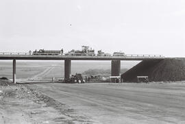 "Fotografia preta e branca em formato paisagem. Representante digital consta manchas brancas. Registro térreo da Estrada Parque Aeroporto (EPAR ou DF-047) em processo de pavimentação, com a ponte do trevo de interligação da Estrada Parque Guará (EPGU ou DF-051) no plano central da fotografia, e a Estrada Parque das Nações (EPNA ou DF-004), em Brasília-DF, durante os primeiros anos da construção capital (1956-1958). A ponte se encontra em processo de construção, aparentando estar em processo de asfaltamento, havendo a presença (sobre a ponte) de: uma caminhonete com caçamba; três tratores de terraplenagem; sete operários dispersos pela infraestrutura da ponte. Na parte inferior da ponte identificam-se seis operários, sendo: dois à direita do maquinário (provavelmente destinado à pavimentação da EPAR) na sombra da estrutura; três agachados próximos do maquinário; um à esquerda do maquinário, caminhando no sentido do registro. Ainda abaixo da ponte, alguns tonéis metálicos aglomerados perto dos pilares e outros caídos próximos ao talude de sustentação da estrutura. A frente da ponte, duas cancelas bloqueando o tráfego no sentido ao “Balão do Aeroporto”, responsável por conectar as vias Estrada Parque Aeroporto (EPAR ou DF-047) e a Estrada Parque Dom Bosco (EPDB ou DF-025), evidenciando o processo de obra no local. No chão, no quadrante inferior esquerdo, resquícios de materiais (pedras, areia e terra), e marcações de passagem de maquinário. Ao fundo, após a ponte, à direita, montantes de materiais utilizados na obra. À esquerda, nos canteiros centrais e laterais da via, identificam-se tonéis espalhados sobre o solo terroso. Mais ao fundo encontram-se: a vegetação de mata de galeria que acompanha o Córrego Riacho Fundo; a continuidade da extensão da via EPAR, até sua conexão com o “Balão do Aeroporto”. No plano de fundo do registro, na linha do horizonte há a presença da vasta vegetação de Cerrado, trechos campestres (campo sujo/limpo) e trechos com maior densidade de árvores (fitofisionomia não identificada).