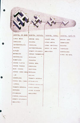 "Fotografia em cores, formato paisagem, Mário Fontenelle. Imagem de um documento sobre a estrutura de uma rede hospitalar para o Distrito Federal. A folha é dividida verticalmente em quatro partes - hospital de base, hospital distrital, hospital rural e hospital satélite -, cada uma correspondente a um nível de hierarquia da rede. Abaixo de cada segmento dessa divisão, encontram-se os serviços ofertados por agrupamento hospitalar, sendo o hospital de base o que possui mais especializações médicas e os hospitais rural e satélite os que têm menos.