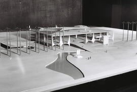 "Fotografia em preto e branco, no formato paisagem, que retrata uma maquete em perspectiva do palácio presidencial (primeiro projeto - segunda versão), possivelmente elaborada entre os meses de agosto e dezembro de 1956.