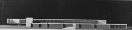 Fotografia em preto e branco, formato paisagem com marca de rasgo ao centro na parte inferior. Maquete de um edifício não identificado e sem compreensão de seu uso aparentando ser residencial ou hotel. Este possui varandas laterais e o que aparenta ser representação de cobogós na fachada e volumes desalinhados.