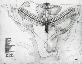 "Fotografia em preto e branco, formato paisagem, autor desconhecido. Imagem do mapa geral, na escala 1:25.000, do Plano Piloto de Brasília (PPB), projetado por Lucio Costa (1902-1998) para o Concurso Nacional do Plano Piloto da Nova Capital do Brasil. Na fotografia, além do desenho de locação do projeto nas proximidades do Lago Paranoá, o arquiteto e urbanista apresenta, por meio de formas e números, as principais áreas que devem compor o PPB. Por essa razão, acompanham o mapa, uma legenda numérica, o título do projeto, a assinatura do autor e a data, localizados no canto inferior esquerdo da prancha de urbanismo. Também, encontram-se representados o norte e a escala gráfica, na parte inferior direita.