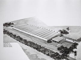 "Fotografia em preto e branco, formato paisagem, autor desconhecido. Imagem do croqui da Escola Normal da Companhia Urbanizadora da Nova Capital do Brasil (Novacap). A ilustração, feita com tinta nanquim, apresenta a vista aérea (perspectiva de voo de pássaro) da escola pioneira com as propostas de paisagismo e de paginação do piso externo, além de escala humana e automobilística. O projeto é um exemplar da arquitetura moderna, fator que é notório devido a adoção de volumes simples e cobertura shed, com platibanda, para compor a obra, e emprego da vedação externa em pele de vidro (cortina de vidro). Ainda, no projeto, um vasto gramado circunda a construção - composta por três volumes retangulares, sendo dois menores e um maior -, enquanto espécies arbóreas compõem um cinturão de vegetação que delimita os limites do lote.