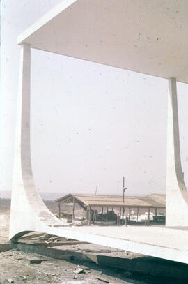 "Fotografia em cores, formato retrato. Vista próxima à marquise, cobertura que protege e circunda as fachadas, do Palácio do Supremo Tribunal Federal (STF). Em primeiro plano, chão de terra batida com materiais da construção. Em destaque, vista diagonal da curvatura de duas das sete colunas do edifício que estão nas fachadas leste e oeste a partir de sua elevação para a cobertura. Ao fundo, entre as colunas, terra batida um poste de madeira e uma construção simples com cobertura e sob o mesmo, materiais de construção e um homem trabalhando. Logo atrás, outro homem trabalhador e área de Cerrado aparentemente não modificado.