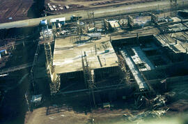 Fotografia em cores, no formato paisagem. Fotografia tirada a partir da fachada posterior do palácio presidencial. Imagem com vista parcial do Palácio do Planalto em construção, monumento sede do Poder Executivo, o prédio em formato retangular, possui quatro andares, mais um subsolo e um anexo semienterrado, tem 36 mil metros quadrados; a arquitetura do palácio tem como principais características a pureza das linhas, com predomínio de traços horizontais, e a mescla entre curvas e retas, tais colunas, transmitem um aspecto de suspensão à cortina de vidro que compõem o corpo do palácio. Obra em estágio inicial destacando-se o corpo construtivo formado majoritariamente por madeira. À frente da fachada frontal do palácio, é possível notar a estrutura do parlatório, situado à direita da entrada principal, em formato oval, também revestido de mármore, com altura de aproximadamente 6,5m, local onde o presidente e convidados podem se dirigir ao povo na praça. À esquerda do parlatório vê-se uma caixa d’água temporária da obra com a placa com as letras “PFD”. identificando a construtora do Palácio do Planalto (Pacheco Fernandes Dantas), vários trabalhadores da época acreditavam ser “PFD” de Palácio Federal dos Despachos (ref. palácio do planalto - entre o cristal e o concreto). Na parte superior da imagem é possível ver uma faixa de chão de terra batida, resultado de um processo de terraplenagem, onde viria a passar a via N1 do Eixo Monumental, logo acima da via aparecem alguns materiais de construção dispostos no terreno da Praça dos Três Poderes, praça cívica onde se reúnem três importantes monumentos da política brasileira, projetada em formato de triângulo equilátero, inspirada na ideia do equilíbrio entre os 3 poderes: Legislativo, Executivo e Judiciário; cunhada por Montesquieu.