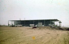 "Fotografia em cores, no formato paisagem, com pequena mancha amarela na parte central inferior da fotografia e alguns sinais de deterioração. Em primeiro plano o terreno da Praça dos Três Poderes, praça cívica onde se reúnem três importantes monumentos da política brasileira, projetada em formato de triângulo equilátero, inspirada na ideia do equilíbrio entre os 3 poderes: Legislativo, Executivo e Judiciário; cunhada por Montesquieu (1689-1755) (Palácio do Planalto - Entre o cristal e o concreto, p.23), ainda em terra batida, resultado de um processo de terraplanagem, com uma pilha de areia um pouco à direita da imagem; é possível ver alguns caminhões carregando materiais de construção no terreno da praça. Em segundo plano o Palácio do Planalto, prédio em formato retangular, possui quatro andares, mais um subsolo e um anexo semienterrado, tem 36 mil metros quadrados; a arquitetura do palácio tem como principais características a pureza das linhas, com predomínio de traços horizontais, e a mescla entre curvas e retas, tais colunas, transmitem um aspecto de suspensão à cortina de vidro que compõem o corpo do palácio, com a sequência de nove colunas-curvas harmoniosas encadeadas, revestidas de mármore branco texturizado, sem ornamentos, elementos visuais que remetem a redes, velas de barco, que se movimentam no ar (Palácio do Planalto - Entre o cristal e o concreto, p.18, p.20), cada uma com 14,4m de altura e um espaçamento de 12,5m (Palácio do Planalto - Entre o cristal e o concreto, p.51) de fachada frontal com dois andaimes nas colunas que estão uma de cada lado da rampa de acesso ao salão nobre, colunas que sustentam a laje de cobertura que protege o palácio e tem área correspondente a 7346 m², feita de concreto obtido com mistura de areia de mina, muito fina, e seixos rolados de quartzito, retirados do Rio Corumbá (Palácio do Planalto - Entre o cristal e o concreto, p. 51), a rampa ainda em estágio intermediário de construção, rampa que se eleva lentamente do solo (Palácio do Planalto - Entre o cristal e o concreto, p.20), com largura de pouco mais de 7,5m, com o plano inclinado de 32m de comprimento, inspirada na escadaria do Palácio do Catete (atual Museu da República, Rio de Janeiro), e o parlatório situado à direita da entrada principal, em formato oval, também revestido de mármore, com altura de aproximadamente 6,5m, local onde o presidente e convidados podem se dirigir ao povo na praça. (Palácio do Planalto - Entre o cristal e o concreto, p.70), com a estrutura finalizada, mas sem acabamento; entre a rampa e o parlatório está a placa da Construtora Pacheco Fernandes Dantas Ltda., responsável pela construção do palácio presidencial; na lateral esquerda da rampa está a placa da Companhia Urbanizadora da Nova Capital (NOVACAP) identificando a obra do Palácio do Planalto. À direita do palácio aparece a caixa d’água temporária da obra com a placa com as letras “PFD”. identificando a construtora do Palácio do Planalto (Pacheco Fernandes Dantas), vários trabalhadores da época acreditavam ser “PFD” de Palácio Federal dos Despachos (Palácio do Planalto - Entre o concreto e o cristal, p.46, p.47)