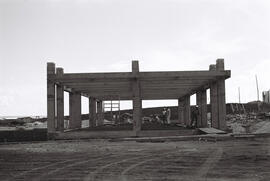 "Fotografia em preto e branco no formato paisagem. Em evidência, a obra do Congresso Nacional em andamento, com enquadramento fechado somente na porção referente à área de intervenção dos Anexos, vista da fachada lateral esquerda (norte) na direção da via S1 do Eixo Monumental. Os Anexos, domicílio dos gabinetes do Senado e da Câmara dos Deputados, constituem um edifício em altura composto por duas torres gêmeas lamelares (formato de lâmina) de 29 pavimentos, unidas por meio de passarelas suspensas que também servem como contraventamento da construção. Em termos estruturais, a edificação foi executada sistema viga-pilar em aço, a laje é em concreto pré-moldado, as fachadas laterais de maior superfície (norte e sul) são em cortina de vidro, enquanto as fachadas frontal e posterior (leste e oeste) correspondem a empenas cegas revestidas em mármore branco. Em primeiro plano, há chão de terra compactada com marcas de pneu, algumas peças em madeira amontoadas e uma tábua longa de madeira, utilizada como passarela, conectando a parte mais elevada do terreno diretamente à estrutura em construção. Em segundo plano, em destaque, observa-se o esqueleto de aço das torres dos Anexos em processo de montagem, estando somente um de seus andares completamente visível, enquanto, à esquerda, há indícios da continuidade da estrutura do subsolo. No momento do registro, estão ausentes a vedação externa e a laje da edificação, percebe-se a presença de trabalhadores transitando essa área por meio de passarelas feitas com tábuas de madeira apoiadas sobre as vigas metálicas, há um andaime montado e, na área circundante, avista-se grande quantidade de materiais de construção como montes de brita e de areia e uma grande quantidade de tábuas de madeira empilhadas utilizadas, possivelmente, como fôrma de concreto e escora, presumivelmente, destinadas ao descarte. No plano de fundo, olhando através da estrutura, à esquerda, percebe-se uma pequena edificação em madeira e maquinário e, em direção ao lado direito, um grande amontoado de terra proveniente, ao que tudo indica, da escavação do terreno para implantação do edifício.