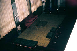 "Fotografia em cores, formato paisagem. Vista do segundo pavimento para da sala de estar do pavimento térreo do Palácio da Alvorada. Na sala de estar, em sentido anti-horário, relaciona-se os seguinte mobiliário: um sofá de quatro lugares na cor vinho em veludo, um recamier (móvel de origem francesa que não tem encosto), uma mesa de centro com pé metálico e tampo de vidro, cinco poltronas Barcelona, na cor preta, de autoria do arquiteto alemão Mies van der Rohe (1886-1969) com a arquiteta e designer alemã Lilly Reich (1885-1947) realizada em 1929 de aço cromado e couro com dimensões de 72x72x77 cm, e um tapete de veludo em um tom bege. O piso da sala de estar é de madeira e cobrindo as janelas da fachada leste cortinas levemente transparentes na cor bege/branco.