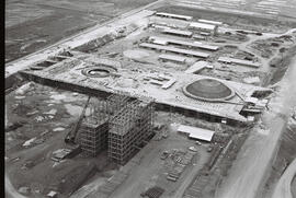 "Fotografia área, formato paisagem. Vista aérea do Congresso Nacional. Em primeiro plano, destaca-se um guindaste levantando os pilares para a constituição das torres anexas ainda com pouquíssimos pavimentos e com suas estruturas de aço aparente, tal maquinário localiza-se perto da fundação deste monumento, ao seu lado estão vigas e pilares posicionados ao chão enfileirados. Na parte posterior do guindaste, observa-se outras peças de aço posicionadas ao canto em meio a um terreno bem desgastado com recursos das obras espalhados como areia e tábuas de madeira. Nota-se que nos edifícios anexo da esquerda, há pilares soltos sem a ligação com vigas e operários encontram-se no último andar em cima de um tapume madeira, já na outra torre a cobertura mostra-se mais completa com as vigas interligadas aos pilares e um tapume de madeira no andar de baixo repete-se à frente da cobertura somente. No sentido leste das torres anexas, visualiza-se no terreno, ao centro, uma pequena área forma elíptico com mais materiais metálicos, no seu lado esquerdo, encontra-se um operário posicionando as cargas em uma caçamba de caminhão ao lado de mais quatros obreiros que observam a cena. Acima, há um outro caminhão branco transitando perto de um operário fixo em pé. Adiante, encontra-se outro veículo deslocando perto da fachada de uma construção temporária que se assemelha a um alojamento, verifica-se que a parte estrutural da edificação a direita está sem vedação, um caminhão direciona-se a essa localidade. À frente, visualiza-se a parte posterior do edifício principal em franco processo de cimbramento, que consiste na sustentação temporária das formas de concreto durante a construção, a partir de escoras no sentido oeste e no sentido leste observa-se o processo de desmontagem dessas estruturas. Acima, na plataforma,repleta de perfurações no piso, a qual abriga o Senado em fase bem inicial de edificação envolta em uma forma circular que estende-se até uma edificação simplória fora da plataforma. Ao centro, estão reunidas algumas construções temporárias. No lado esquerdo, observa-se que a Câmara está ainda em processo de fundação. Adiante, visualiza-se que a rampa externa está também em fase construtiva inacabada à sua esquerda encontra-se uma construção provisória em meio a vários materiais de construção, observa-se que na extremidade esquerda, há um grande acúmulo de areia próximo a dois postes e uma rampa simples de madeira que leva a plataforma. No lado oposto ajuntamento de escoras madeiras desmontadas espalhadas no chão. Logo depois, destaca-se um pequeno alojamento com a bandeira do Brasil hasteado na cobertura, o qual detém um pequeno estacionamento com dois automóveis estacionados cercados por três indivíduos, mais dois perambulam perto dessa região. À esquerda, situam -se consecutivamente duas edificações impermanentes, permeado por um pequena construção de menor expressão. A seguir, estacionamento coberto com alguns automóveis parados nas vagas, à esquerda está mais uma edificação temporária de pequena dimensão, adjacente a um poste. Percebe-se deslocando-se ao estacionamento, um caminhão próximo a edificação temporária. Posteriormente, há outra construção bastante diminuta próximo a duas caixas d' água: uma pequena proporção paralela a ela e outra adjunta a outra grande edificação. Ulteriormente, pousa-se outro estacionamento de aspecto longitudinal pouco distanciada de outra construção temporárias, as quais provavelmente serviam de alojamento para os trabalhadores ou para acúmulo de materiais. Compondo a região, constata-se que a via N1, Eixo Monumental, ainda não pavimentada, detém um trajeto mais longo que a via S1, localiza-se no outro oposto, também sem pavimentação, com parte de seu trajeto planejado está efetuado, parte do espaço desse percurso está densamente ocupado por acúmulos de recursos da obra. No lado esquerdo alastra-se pelo terreno um grande descampado. Ao fundo desse complexo, situa-se um perímetro que é possível enxergar alguns perfis metálicos espalhados pelo solo.