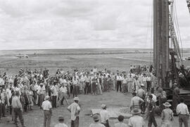 "Fotografia preto em branco, formato paisagem. Círculo de pessoas, em volta do que seria a fundação do Congresso Nacional, fitando o olhar para a moderna bate estaca da marca Franki. Na extrema direita, ressalta-se a presença a bate estaca com sua grande verticalidade e seus enormes fios que se conectam ao topo, alguns estão pairando no ar. Perto da base do maquinário sobressai um grupo de quatro trabalhadores reunidos, destoa-se nesse agrupamento, um operário uniformizado encostado na parte inferior da máquina e outro obreiro, utilizando chapéu redondo, olhando fixamente ao topo da bate-estaca. Bem próximo a eles, há uma estrutura simples de madeira servindo para armazenar o material que sai das perfurações da bate estaca. Contrasta no ambiente, ao centro e no lado esquerdo, a presença de indivíduos com vestimentas mais sociais e de mulheres no canteiro de obras, algo mais incomum à época, é possível visualizar também algumas crianças em meio a multidão. Ao fundo, predomina o franco processo de desmatamento da vegetação nativa, apenas há uma pequena faixa pequena com uma vegetação um pouco mais densa, em paralelo o agrupamento de indivíduos, verifica-se sutilmente, na extremidade esquerda, o caminhão percorrendo um trecho do grande terreno.
