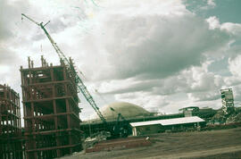 "Fotografia em cores no formato paisagem. Em destaque, o Congresso Nacional em processo de construção, ângulo da fachada posterior (leste). No primeiro plano à esquerda, percebe-se os anexos, formados por duas torres verticais, que abrigam os gabinetes do Senado e da Câmara dos Deputados. Os anexos constituem um edifício em altura com torres gêmeas lamelares (formato de lâmina) com 29 pavimentos, unidas por meio de passarelas suspensas, que também servem como contraventamento da construção. Em termos estruturais, a edificação foi executada sistema viga-pilar em aço, a laje é em concreto pré-moldado, as fachadas laterais de maior superfície (norte e sul) são em cortina de vidro, enquanto as fachadas frontal e posterior (leste e oeste) correspondem a empenas cegas revestidas em mármore branco. A estrutura metálica dos anexos está em processo de montagem, estando o último pavimento erigido ainda sem as vigas, e o restante da edificação desprovida das lajes ou vedação. Percebe-se na lateral do esqueleto de aço a presença de um guindaste içando um pilar de aço e, mais a frente do maquinário, há uma figura humana, possivelmente um operário, próximo a perfis de aço com a inscrição ""Bethlehem"", contração de ""Bethlehem Steel Corporation"", nome da indústria siderúrgica norte-americana responsável pelo fornecimento do aço utilizado no Congresso Nacional e nos edifícios ministeriais. Em segundo plano, há um barracão de obra em madeira com a presença de figuras humanas e, nas imediações, percebe-se uma grande quantidade de tábuas de madeira empilhadas utilizadas, possivelmente, como fôrma de concreto e escoras. Na lateral direita do barracão, há um caminhão e uma torre em madeira com uma placa fixada na parte mais elevada. Ainda em segundo plano, porém atrás dessas áreas de apoio, encontra-se o Edifício Principal do Congresso Nacional. Essa edificação corresponde à plataforma horizontal de estrutura em concreto armado e revestimento de mármore branco, encimada pelas célebres cúpulas que abrigam os Plenários do Legislativo: a menor, de formato côncavo, corresponde ao Senado Federal, enquanto a maior, de formato convexo, equivale à Câmara dos Deputados. Ao que tudo indica, a laje de cobertura permanece escorada ou com andaimes montados e a cúpula côncava está já concretada, porém ainda sem a pintura branca.