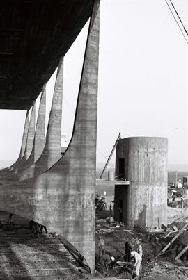 "Fotografia em preto e branco, no formato retrato. Em primeiro plano tem-se a vista parcial da fachada principal do Palácio do Planalto, prédio em formato retangular, possui quatro andares, mais um subsolo e um anexo semienterrado, tem 36 mil metros quadrados; a arquitetura do palácio tem como principais características a pureza das linhas, com predomínio de traços horizontais, e a mescla entre curvas e retas, tais colunas, transmitem um aspecto de suspensão à cortina de vidro que compõem o corpo do palácio; aparecendo também a sequência de nove colunas-curvas harmoniosas encadeadas, revestidas de mármore branco texturizado, sem ornamentos, elementos visuais que remetem a redes, velas de barco, que se movimentam no ar (Palácio do Planalto - Entre o cristal e o concreto, p.18, p.20), cada uma com 14,4m de altura e um espaçamento de 12,5m (Palácio do Planalto - Entre o cristal e o concreto, p.51); tais pilares sustentam a laje de cobertura, que protege o palácio e tem área correspondente a 7346 m2, feita de concreto obtido com mistura de areia de mina, muito fina, e seixos rolados de quartzito, retirados do Rio Corumbá; na base dos pilares estão algumas figuras masculinas, possivelmente trabalhadores da obra. Mais ao fundo, é possível ver o parlatório, situado à direita da entrada principal, em formato oval, também revestido de mármore, com altura de aproximadamente 6,5m, local onde o presidente e convidados podem se dirigir ao povo na praça. Os itens NOV-D-4-4-B-2 (456), NOV-D-4-4-B-2 (457), NOV-D-4-4-B-2 (458), NOV-D-4-4-B-2 (459), NOV-D-4-4-B-2 (463) fazem parte de uma provável sequência.