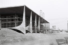 "Fotografia em preto e branco, no formato paisagem. Em primeiro plano está o Palácio do Planalto, prédio em formato retangular, possui quatro andares, mais um subsolo e um anexo semienterrado, tem 36 mil metros quadrados; a arquitetura do palácio tem como principais características a pureza das linhas, com predomínio de traços horizontais, e a mescla entre curvas e retas, tais colunas, transmitem um aspecto de suspensão à cortina de vidro que compõem o corpo do palácio; ao lado do palácio é possível ver uma pilha de britas, provavelmente utilizadas na obra. A fachada principal caracteriza-se pela rampa de acesso ao salão nobre, rampa que se eleva lentamente do solo (Palácio do Planalto - Entre o cristal e o concreto, p.20), com largura de pouco mais de 7,5m, com o plano inclinado de 32m de comprimento, inspirada na escadaria do Palácio do Catete (atual Museu da República, Rio de Janeiro); em cada lado da rampa tem uma estrutura de andaime auxiliando na construção dos pilares de sustentação da laje de cobertura do palácio, parte da sequência de nove colunas-curvas harmoniosas encadeadas, revestidas de mármore branco texturizado, sem ornamentos, elementos visuais que remetem a redes, velas de barco, que se movimentam no ar (Palácio do Planalto - Entre o cristal e o concreto, p.18, p.20), cada uma com 14,4m de altura e um espaçamento de 12,5m (Palácio do Planalto - Entre o cristal e o concreto, p.51). O parlatório situado à direita da entrada principal, em formato oval, também revestido de mármore, com altura de aproximadamente 6,5m, local onde o presidente e convidados podem se dirigir ao povo na praça. (Palácio do Planalto - Entre o cristal e o concreto, p.70). Entre a rampa e o parlatório está a placa da Construtora Pacheco Fernandes Dantas Ltda., responsável pela construção do palácio presidencial; na lateral esquerda da rampa está a placa da Companhia Urbanizadora da Nova Capital (NOVACAP) identificando a obra do Palácio do Planalto. Logo atrás do parlatório, pouco acima do topo, aparece a caixa d’água temporária da obra com a placa com as letras “PFD”. identificando a construtora do Palácio do Planalto (Pacheco Fernandes Dantas), vários trabalhadores da época acreditavam ser “PFD” de Palácio Federal dos Despachos (Palácio do Planalto - Entre o concreto e o cristal, p.46, p.47). Os itens NOV-D-4-4-B-2 (456), NOV-D-4-4-B-2 (457), NOV-D-4-4-B-2 (458), NOV-D-4-4-B-2 (459), NOV-D-4-4-B-2 (463) fazem parte de uma provável sequência.