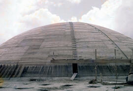 "Fotografia em cores, formato paisagem com pequenas manchas amareladas e alguns ricos ao longo da fotografia. Vista da cúpula do Senado Federal do Palácio do Congresso Nacional em fase de construção sem revestimento. Em primeiro plano, a laje que é a base das cúpulas com alguns buracos no mesmo (talvez para iluminar a parte inferior durante as obras). Além disso, diversos materiais de construção como barras metálicas, uma pequena caixa de madeira para transporte de ferramentas, uma estrutura semelhante a um andaime e um trabalhador com vestes simples no canto direito da fotografia. Na base da cúpula e apoiado sobre o mesmo, diversas barras metálicas e algumas tábuas de madeira posicionadas paralelamente à esquerda. Sobre a cúpula, ao centro, uma escada provisória de madeira para acesso à cobertura do mesmo.