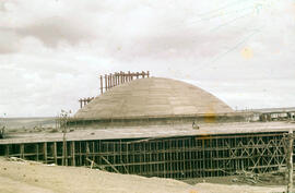 "Fotografia em cores, formato paisagem com pequenas manchas amareladas e alguns ricos ao longo da fotografia. Vista da cúpula do Senado Federal do Palácio do Congresso Nacional em fase de construção sem revestimento. Em primeiro plano, à esquerda da fotografia, chão de terra batida do que será o Eixo Monumental. Em segundo plano, encontra-se (à esquerda) um poste de madeira e o Edifício Principal do Congresso Nacional. Essa edificação corresponde à plataforma horizontal de estrutura em concreto armado e revestimento de mármore branco, encimada pelas célebres cúpulas que abrigam os Plenários do Legislativo: a menor, de formato côncavo, corresponde ao Senado Federal, enquanto a maior, de formato convexo, equivale à Câmara dos Deputados. A edificação ainda está sem a cortina de vidro (componente construtivo de vedação, composto por vidros fixados em malha de perfis metálicos contínuos, que se desenvolvem no sentido da altura e/ou da largura da fachada da edificação, por pelo menos dois pavimentos), apenas com estruturas temporárias. Sobre a laje, há alguns materiais de construção e figuras humanas caminhando e atuando na obra. Na base da cúpula do Senado, um pequeno andaime circunda toda a sua base, além de ser possível visualizar a escada provisória sobre a cúpula para os trabalhadores terem acesso à sua cobertura. À direita, mais figuras humanas e um abrigo provisório de madeira que aparenta ser para armazenamento provisório de materiais. Atrás da cúpula, percebe-se o início da construção dos anexos, formados por duas torres verticais, que abrigam os gabinetes do Senado e da Câmara dos Deputados. Os anexos constituem um edifício em altura com torres gêmeas lamelares (disposição de lâmina) com 29 pavimentos, unidas por meio de passarelas suspensas, que também servem como contraventamento da construção. Em termos estruturais, a edificação foi executada sistema viga-pilar em aço. No horizonte, bioma do Cerrado.