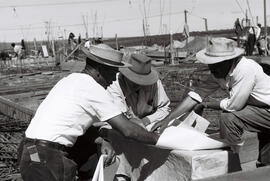 "Fotografia em preto e branco no formato paisagem, destaca três trabalhadores no canteiro de obras do Palácio da Alvorada. Situado às margens do Lago Paranoá e foi o primeiro edifício de alvenaria inaugurado em 30 de junho de 1958 no embrião de Brasília. Em primeiro plano há 3 trabalhadores voltados para uma prancha posta sobre um apoio improvisado coberto por uma lona. Do lado esquerdo um homem de pele negra, usando camisa branca de mangas curtas, chapéu de palha, uma calça jeans, onde no bolso direito da mesma, localiza-se uma escala métrica dobrável, um anel no dedo anelar e um relógio no pulso do lado esquerdo onde segura uma prancha dobrada. O segundo trabalhador no centro da fotografia, usa um chapéu, camisa de mangas longas com canetas no bolso esquerdo. O terceiro trabalhador ao lado direito, usa um chapéu, camisa de mangas dobradas na altura dos cotovelos com um lápis no bolso, calça jeans e um relógio no pulso esquerdo onde ele segura algumas pranchas.