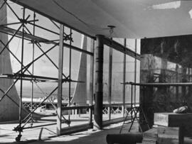 Fotografia em cores, formato paisagem. Vista da construção do que viria a ser a sala de estar e a sala de música do Palácio da Alvorada. Situado às margens do Lago Paranoá e foi o primeiro edifício de alvenaria inaugurado em 30 de junho de 1958 no embrião de Brasília. Considerado um dos grandes ícones da Arquitetura Moderna brasileira, seu projeto foi concebido por Oscar Niemeyer (1907-2012), o engenheiro Joaquim Cardozo (1897-1978) responsabilizou-se pelo cálculo estrutural e a execução ficou a cargo da Construtora Rabello SA. No terceiro terço à direita da fotografia, há uma parede em mármore na cor preta com um andaime e alguns caixotes a sua frente. Próximo as esquadrias das janelas, na parte exterior, um andaime, ao fundo dois duas colunas, sendo uma delas, ao lado direito, a semi-coluna da rampa de acesso central ao edifício, na segunda metade do lado esquerdo da fotografia uma coluna completa, a forma definitiva é resultado, especialmente, do projeto estrutural, de Joaquim Cardozo (1897 - 1978). Portanto, a curvatura estabelecida foi definida pela função de 4º grau y= 0,037x⁴ - 0,190x³ + 0,381x² -0,048x (ALMEIDA, 2012, p. 86). Em terceiro plano dispõe-se a vista do anexo de serviços da Residência Oficial do Presidente da República, com 7 operários sobre a laje. O Palácio da Alvorada foi construído para ser a residência oficial da Presidência da República, horizontalizado em concreto armado revestido de mármore branco e vedado com cortina de vidro, levemente suspenso do chão, circundado em toda sua extensão por esbeltas colunas brancas de curvas cônicas, que perpassam sua função estrutural e constituem um dos elementos mais emblemáticos da composição plástica do Palácio. Na fachada frontal, a entrada principal é direcionada por um espelho d’água, reforçando a intenção de leveza da arquitetura, e abriga a escultura “As Iaras”, obra de autoria do escultor Alfredo Ceschiatti (1918-1989). Além do edifício principal, o conjunto do Alvorada conta com bloco um semienterrado de serviço e com uma pequena capela anexa, cuja expressão pictórica remete à obra do arquiteto Modernista Le Corbusier (1887-1965) da “Chapelle Notre-Dame du Haut” (Capela Nossa Senhora das Alturas), mais conhecida como Capela Ronchamp, localizada na França. O projeto de paisagismo é de autoria de Yoichi Aikawa, na época jardineiro do Palácio Imperial do Japão, e complementado nos anos 90 pela arquiteta e paisagista Alda Rabello Cunha (1929-2021). O conjunto do Palácio da Alvorada foi tombado a nível Federal pelo Instituto do Patrimônio Histórico e Artístico Nacional (IPHAN) em 22 de abril de 2021.