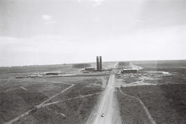 Fotografia em cores, formato paisagem. Vista frontal, dos monumentos componentes da Praça dos Três Poderes, ao centro, encontra-se o Congresso Nacional composto por dois anexos destinados aos escritórios administrativos de 92 metros, ainda repleta de andaimes, assim como a cúpula do Câmara apresenta-se ainda com acabamento incompleto. Já a cúpula do Senado, está em estágio mais avançado de finalização em sua estruturação e encontra-se com a pintura inacabada. Ao redor, há poucos galpões e depósitos acumulados de materiais. Ao lado direito, atravessando o complexo que engloba a Praça dos Três Poderes e a Esplanada dos Ministérios, está o Eixo Monumental em fase inicial de construção, sem pavimentação, com bastante degradação ao centro, uma caminhonete percorrendo a via terrestre. No lado direito, há o Palácio do Planalto quase concluído, em sua lateral, estão reunidos alguns pequenos depósitos agrupados. Já no lado esquerdo, destaca-se o Supremo Tribunal Federal com suas colunas de ainda não finalizadas, circundados por galpões e depósitos que provavelmente de acúmulo de materiais. Mais ao fundo, na Esplanada dos Ministérios há vários edifícios encadeados inconclusos, do lado esquerdo e direito, ao centro, espaços vazios com vegetação.