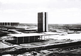 Fotografia em preto e branco, no formato paisagem. Vista aérea dos monumentos componentes da Praça dos Três Poderes e parte da esplanada dos ministérios. A imagem enquadra o Palácio do Supremo Tribunal Federal, cinco dos edifícios ministeriais, o Palácio do Congresso, o Museu Histórico de Brasília e grande parte do terreno delimitado para a praça. No primeiro terço da imagem, na parte superior, aparecem cinco edifícios ministeriais, enfileirados paralelamente, que compõem a esplanada dos ministérios. Entre o primeiro e segundo terço da imagem, na parte inferior, nota-se o Palácio do Supremo Tribunal Federal com suas colunas harmoniosas em duas fachadas (faces leste e oeste) com formato que remete a velas de barco; a caixa de vidro compõe o centro do edifício, dando a sensação de suspensão; a forma simples com elementos marcantes torna o edifício em um espaço convidativo e contemplativo, além de edificações ícones da região; a simplicidade da volumetria também incorpora os aspectos modernistas, característicos da assinatura do arquiteto e urbanista Oscar Niemeyer, responsável pelo projeto dos palácios da Praça dos Três Poderes. No segundo terço da imagem encontra-se o Palácio do Congresso, este edifício situado no vértice superior do triângulo do complexo da Praça dos Três Poderes; é composto pelos edifício principal e dois anexos destinados aos escritórios administrativos; as cúpulas do edifício principal possuem um traço delicado que contrastam com as colunas simétricas, as mesmas correspondem à Câmara dos Deputados (cúpula virada para cima) e o Senado Federal (cúpula virada para baixo); as torres que formam vértices de 92 metros de altura, podem ser vistas desde a Torre de TV e orientam as perspectiva dos visitantes até a Esplanada dos Ministérios. Passando dos dois lados do Palácio do Congresso estão as vias S1 e N1 do Eixo Monumental (respectivamente da esquerda para a direita), é possível ver alguns carros passando nos sentidos das vias. Centralizado no terceiro terço da imagem está o Museu Histórico de Brasília, de concreto armado e mármore branco, sustentado por um par de vigas que formam um bloco de 35 metros de comprimento e 5 metros de largura, apoiado em uma estrutura que abriga a escada que leva ao vão com inscrições nas paredes; em seu interior estão paredes em mármore exibem 16 painéis, que contam a história da mudança da capital; este foi construído para abrigar documentos referentes à história da transferência da capital e foi inaugurado em 21 de abril de 1960. Centralizado no terceiro terço da imagem está o centro da Praça dos Três Poderes, onde há um grande espaço vazio característica marcante da concepção praça cívica, composto de pedra portuguesa. Ao fundo da imagem está o espaço de terra onde posteriormente foi construída a Asa Norte do Plano Piloto.