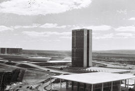 Fotografia em preto e branco, no formato paisagem. Vista panorâmica da Praça dos Três Poderes, em primeiro plano, destaca-se o Supremo Tribunal Federal com suas sequência de colunatas harmoniosas, série de colunas-curvas encadeadas, em duas fachadas do edifício (faces leste e oeste), como formatos que remete a velas de barco. A caixa de vidro dividida nos dois planos horizontais e por pilares verticais localizados, o qual compõem o centro do edifício, dá a sensação de suspensão. A cobertura retangular transmite uma sensação de “caixa sobre caixa”. Ao redor, nota-se que o terreno circundante do Supremo Tribunal Federal, está sendo arado, no canto inferior direito, por alguns tratores e próximo a trilha que percorre a parte lateral do palácio. Uma via longa, já pavimentada, perpassa a área do Praça dos Três Poderes e estende-se até a Esplanada dos Ministérios. Na parte central, está o renque de palmeiras imperiais que imprime uma verticalidade ao conjunto dos monumentos diferenciando com o espaço vazio da praça autônoma do Congresso Nacional. Tal monumento ressalta sua expressividade com os dois anexos verticalizados, de 92 metros, correspondentes aos edifícios administrativos. À frente, as duas cúpulas do edifício do Congresso (Câmara dos Deputados, de maior dimensão e virado à cima e do Senado de menor proporção virado para baixo) contrastam com as colunas simétricas dos anexos administrativos e acrescenta mais beleza a tais torres grandiosas. Mais à frente, é possível visualizar apenas dois prédios ministeriais, próximos ao Eixo Monumental que estende-se por um longo trecho. Mais à direita, ao fundo, é possível visualizar o Cerrado nativo já bastante desmatado.